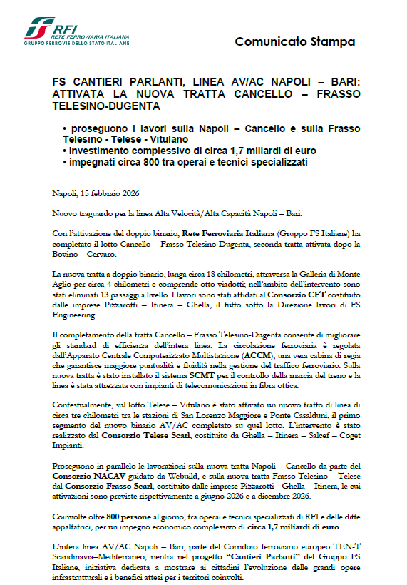 Napoli, 15 febbraio 2026 - Nuovo traguardo per la linea Alta Velocità/Alta Capacità Napoli-Bari.
